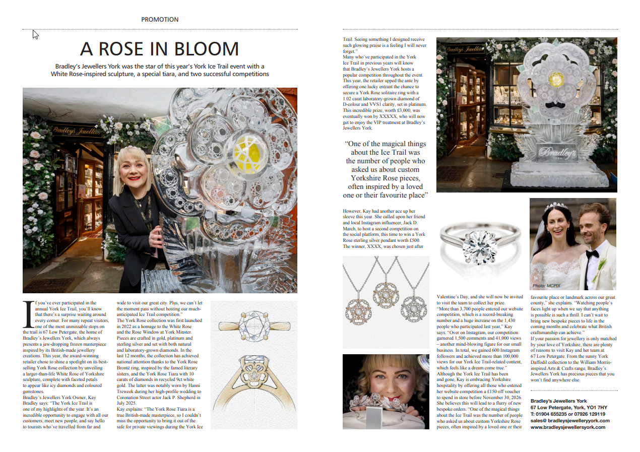 Bradley’s Jewellers York is celebrating the return of the York Ice Trail with a very special Yorkshire Rose-inspired sculpture, a fantastic online competition, and a much-anticipated chance to view the York Rose Tiara. All you need to do is answer one simple question to WIN a York Rose solitaire ring worth £3,000. Don’t miss your chance to secure this beautiful, British-made creation…